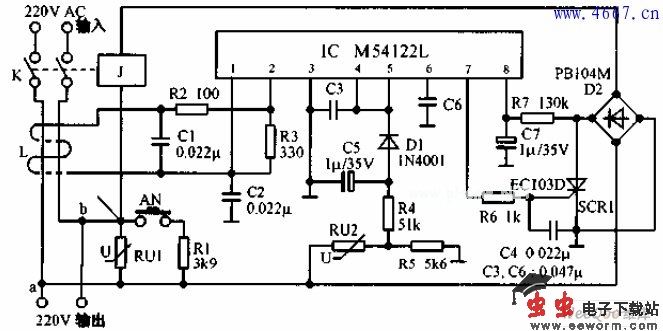 多功能漏电保护开关利用日产专用集成电路M54122L,可以组成多功能漏电保护开关,对漏电和触电情况时,穿过电感线圈中火线和零线产生的磁场相互抵消,在线圈上不产生交流电压。当出漏电或触电时,线圈产生电压,7脚产生高电平而触发可控硅,使继电器动作切断电源。过压保护由Ru1、Ru2、Ru4、Ru5、D1组成。压敏电阻Ru1用于吸收雷电或中线故障等引起的过电压。当电源电压增大,Ru电阻变小,R5上电压增大当电源电压等于275V时,R5上电压约为1.8V经R4、D1进行触发保护。