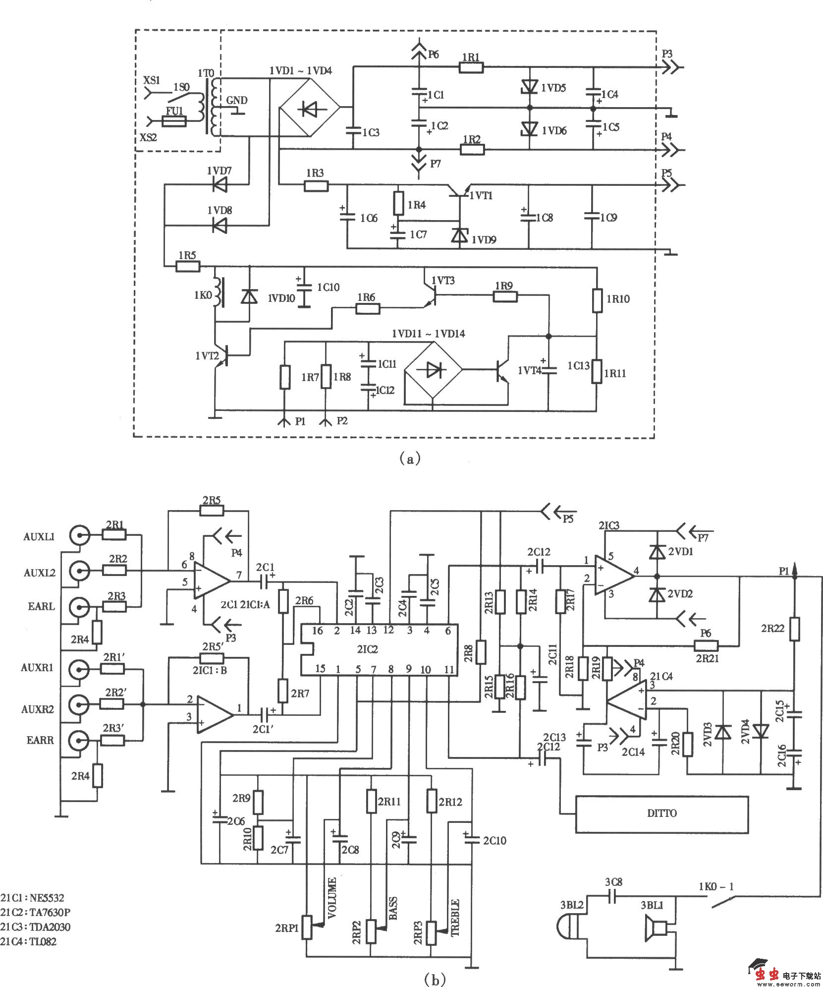 可直接驳接各种音源设备的有源音箱电路 (g)电源及喇叭保护电路;(b)前级放大电路