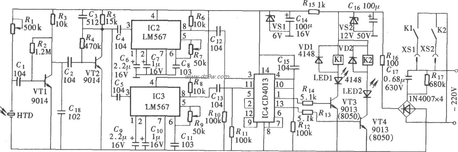 亚超声遥控开关电路(NE555、LM567、CD4013)