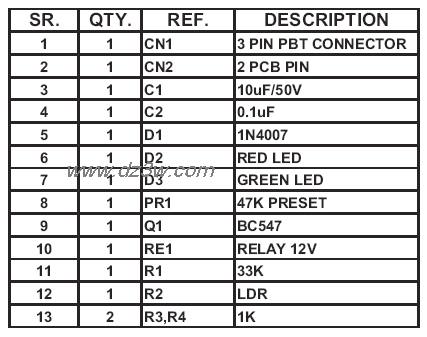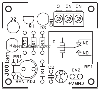 Specifications--------------------------------------------------------------------------------DarkSensitiveSwitchisasimpleprojectwhichoperatesarelaywhenthelightfallingontheLDRgoesbelowasetpoint.Input-12V@55mARelayoutput-NC-C-NOOnboardpresettosetthelevelPower-OnLEDindicatorRelayOnLEDindicatorPowerBatteryTerminal(PBT)foreasyrelayoutputconnectionFourmountingholesof3.2mmeachPCBdimensions44mmx49mm
