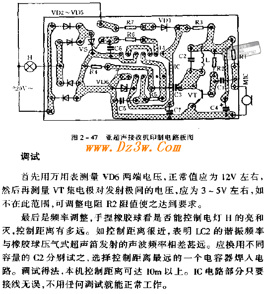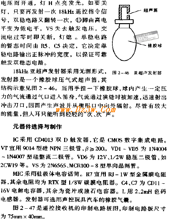 亚超声遥控灯开关电路 所谓亚超声波是指频率稍低于超声波频率下限的声波,这里的亚超声遥控开关是采用18kHz 声波作为遥控指令。 18kHz 声波已到了可闻音频的上限,人耳对它已不敏感,只能听到轻微的“次次”响声,所以用它作为遥控指令既可靠又不会干扰其它家用电器和影响生活。 工作原理 图2-45 是亚超声遥控灯开关的接收机电原理图.VD2,VD5、VS组成灯开关的主回路,控制回路由 IC 及 18kHZ 选频放大器VT等组成。