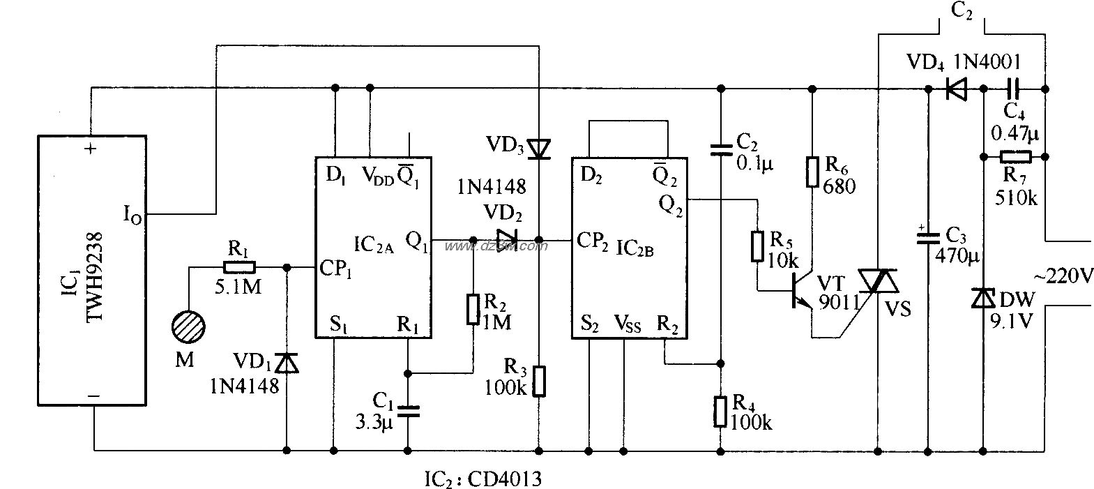 遥控开关电路既可作远距离无线遥控操作,又可在近距离进行触摸控制,使用十分方便。它的组成原理如图所示,主要由无线遥控接收组件、触摸控制电路、双稳态开 关控制电路和电源电路四部分组成。遥控发射电路采用成品组件TWH9236,图中未画出。