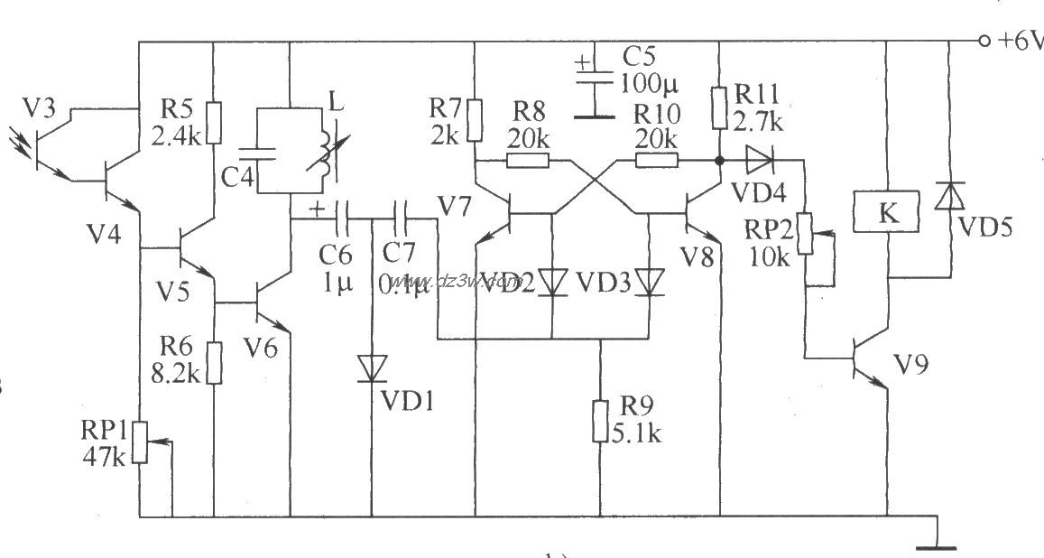 V1、V2、V4~V8均选用S9013型硅NPN晶体管;V3选用3DU5型光敏晶体管;V9选用S8050或C8050、3DG8050型硅NPN晶体管。