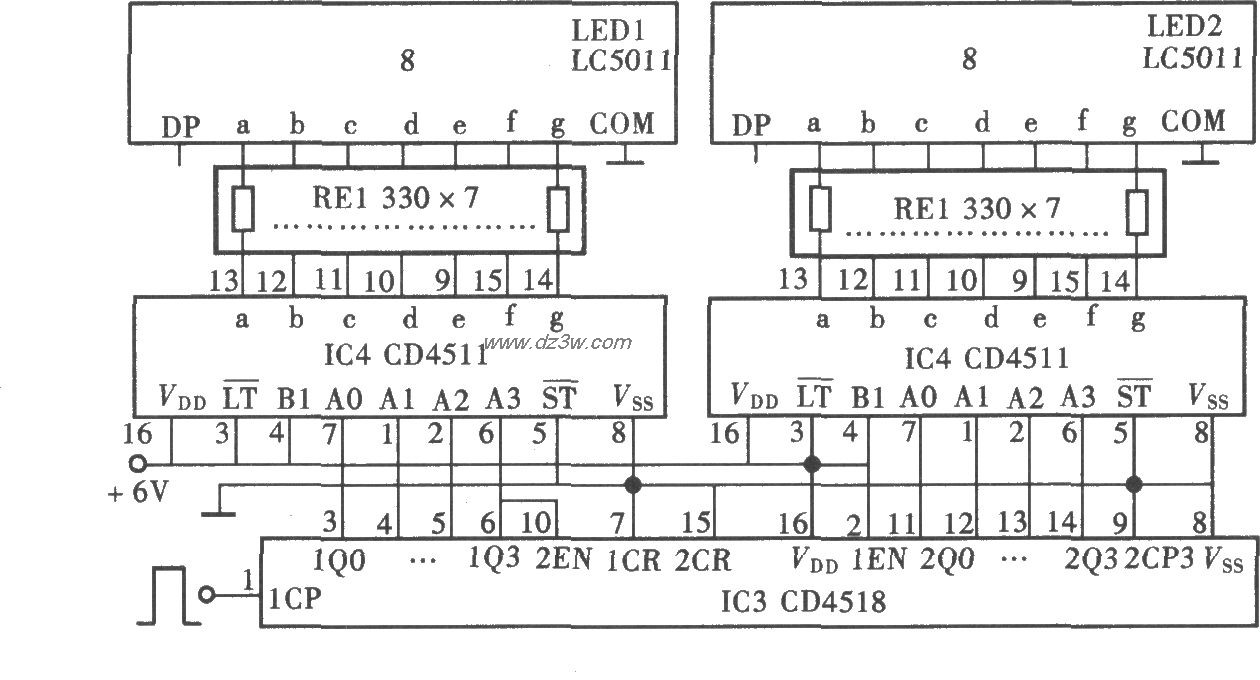 触摸式多通道电子开关(CD4017、CD4511、CD4518) 该触摸式电子开关结构简单,工作可靠,采用通用性数字集成电路,造价低廉。它有20个通道供选用,电路中配有两位数字显示器供通道显示,电路组成如图所示。电路由触摸信号输入电路、控制脉冲形成电路、通道选择电路和通道译码与显示电路组成。触摸信号输入电路由晶体管开关电路VT1组成: 通道译码与数码显示电路: