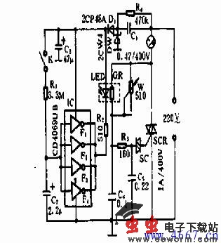 渐亮渐灭照明控制电路 工作原理:当K闭合,R1和C2组成延时电路,使C2的电压逐渐升高,LED慢慢发光。这就使得光敏电阻GR阻值慢慢减少,从而使SCR导通角逐渐增大。电灯也就渐渐亮起来。关灯时,情况相反,SCR导通角随C2放电,C2的端电压将慢慢你地降低而减小。灯泡也就慢慢地熄灭。