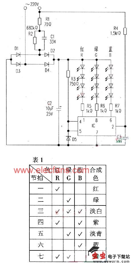 市电220V交流电经R1和R2降压再经Dl~D4全波整流和C2滤波获得约17V左右,再经R3和D5稳压为Ic第④脚、⑤脚提供+12V电源,加电后如果第②脚开路没有时钟信号的情况下.12只发光二极管全部点亮。第①脚串接4只红色发光二极管。第⑧脚串接4只绿色发光二极管,第⑥脚串接4只蓝色发光二极管。当市电50Hz交流信号通过R4进入第②脚触发内部程序控制器时,R、G、B三路输出将按一定顺序逐个发光,出现红绿蓝三色交替变换的彩色光源,平均每2秒一拍,由七个节拍完成一个循环周期(见表1)。