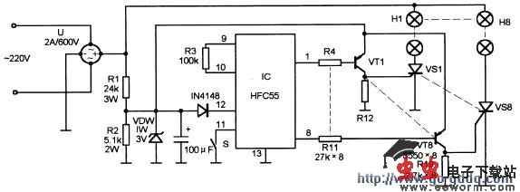 该装置的电路工作原理如图所示。它是一种利用交流电灯泡来作广告牌的应用电路。220V市电经全桥U整流,由电阻R1、R2构成的限流分压电路将电压降低,由VDW将其电压稳定在3V左右,由电容器C1滤波后供给ICHFC55工作。当IC的(1)~(8)脚变为低电平时,相应的三极管VT1~VT8依次导通,触发其单向可控硅VS1~VS8依次导通,从而使大功率的电灯炮群H1~H8依次顺序点亮。其流水速率由IC(9)、(11)脚上的电阻R3阻值确定。