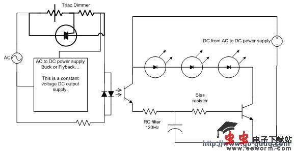 高亮度LED是传统白炽灯的一种理想替代方案,因为前者的寿命和效率都比后者高得多,而且不同于紧凑型荧光灯泡,这些LED能够在低温下工作。然而,和冷阴极荧光灯(CCFL)灯泡一样,高亮度LED也未能摆脱众多家庭和应用中常见的三端双向可控硅(TRIAC)调光器。本文将介绍一种具成本优势的高亮度LED (HB LED)调光方法。
