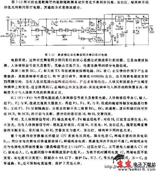 微波感应双色舞姿同步频闪彩灯电路