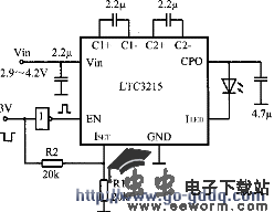 闪光灯电路如图所示。利用EN端与IsET端外接R2及反相器的配合实现闪光。当反相器输入端为高电平时,经反相器输出低电平,此低电平输入LTc3215时,LT3215关闭,ILED为0。当反相器输入低电平时(地电平),反相器输出高电平,EN端接高电平,器件工作,R2接地电平,相当R1//R2,ILED将增加一倍。当低电平脉冲输入时,LED发出闪光。