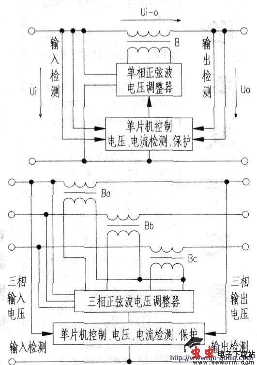 由原理框上图可见,电压补偿变压器B的二次电压(Ui—o)线圈是串联在主回路中的。有关系式:Ui=Ui-o+Uo成立,当改变Ui—o的大小和方向时,就可以调整Uo的大小。