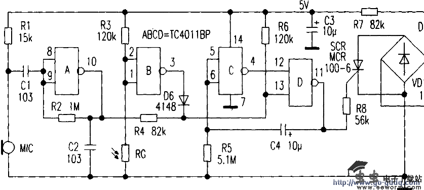 市电经D5整流、R7限流、C3滤波后的工作电压约为5V。在白天,光敏电阻RG阻值小,与非门电路B输入端为低电平,因而B输出高电平。D6导通。平时门电路C输入端为低电平因而输出高电平。由于门电路D的(12)、(13)脚均为高电平,因此(11)脚输出低电平,可控硅SCR截止,照明灯L不亮。在晚上光线弱时,光敏电阻RG阻值变大,B输入端呈现高电平,因而(3)脚输出低电平,D6截止,当话筒MIC接收声波而产生的话音电流加到门电路D的(13)脚后,(11)脚输出高电平,SCR导通,灯L点亮。同时电容C4被充电,灯L继续被点亮,调节R5、C4的值,可改变充电时间的长短,即灯亮延迟时间的长短,按图中数据为22秒。