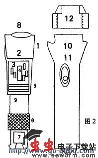 在图1中,1为圆筒形的塑料骨架;2为发白光二极管3为电路板;4为用铜片制作的开关;5为予留的CR2032电池位置;6为空芯线圈,电感量约33mh,线径约φ.2mm;7为强力磁铁,应使它能在圆筒内顺利的上下移动。8为聚焦镜片,它与塑料骨架之间装有橡胶密封圈,使光线更加集中,射程更远;9为橡胶减震圈,避免磁铁直接冲击塑料骨架。将上面的材料作为一体,然后放入右面的塑料电筒外壳10内。电筒的滑动开关11与电路板的铜片相对应,再旋上电筒盖12。这个电筒就能使用了。
