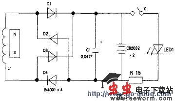 该手摇动式自发电手电筒电路原理如图1所示。其结构示意图如图2所示。在使用电筒时,摇动电筒使它的磁铁7上下移动,通过线圈6即产生电能,再经图2中的D1-D4整流,C1贮能向电池CR2032充电通过开关控制使发白光二极管发光而实现自发电的功能。