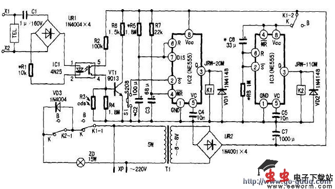 由光耦合器IC1、开关管DWT、手动开关S1及光敏电阻Rcds等组成。触发电路与电话机并联到话线X1、X2上,静态时,由于C1的隔直流作用,话线馈送的48V或60V(由程控交换机型号而定)直流电压对电话灯电路无作用,灯泡ZD不亮。