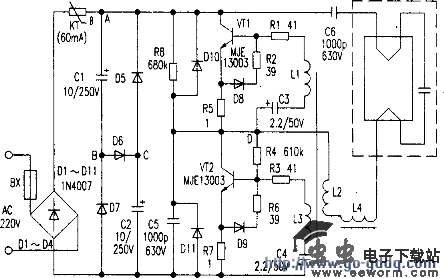 该电路的特点之一是经过降压后,整个电路的电流相对较小;第二个特点是VT1和VT2两管c-e极上承受的直流电压只有110V左右,比其他节能灯电子镇流器和护眼灯的晶体管承受150V电压更安全;第三个特点是后面高频振荡电路中,分别并接在VT1和VT2上的保护二极管D10、D11,能够可靠保护晶体管不被电感L4所产生的自感高压所击穿;该电路的第四个特点是KT能够有效地保护后面电路,防止漏电、过流等故障的扩大.
