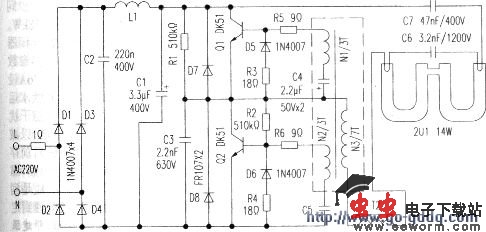 根据实物绘制出电路原理如附图所示,元器件的编号与电路板相同。该电路属于半桥型高频逆变电路,市电220V经保险电阻TR后加至整流管Dl一04桥式整流,由IC2、电感L1、C1组成π型高低频滤波电路,其作用既防止节能灯工作时产生高次谐波对家用视听电器的干扰,又可以进一步减小输出直流电压的交流纹波,对后级电路工作有利。滤波后输出约300V直流电压加至功率管Q1、Q2上。由R1、C3组成启动电路;由Q1、Q2、C4、C5和脉冲变压器T1(绕组N1、N2、N3)组成高频振荡电路;由自感变压器T2、C6、灯管2U1组成串联谐振/照明电路。刚接通电源时,300V直流电压经R1对C3进行充电,当C3充电电压达到一定值时经R2加至Q2的基极,Q2触发导通。然后通过脉冲变压器T1各绕组感应耦合,触发Q2、Q1轮流导通与截止,电路进入振荡状态,产生近似矩形渡的输出脉冲。该脉冲电压经T2、C6产生谐振,在2U1两端获得足够的启辉电压而点燃发光。当灯管点亮后。由于T2的自感作用,使灯管电流恒定,这样既减小灯管的频闪,又起到限流保护作用。确保节能灯安全工作。