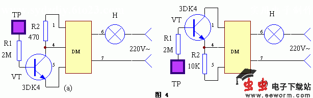 该装置应用电路工作原理如图4(a)、(b)。在(a)中,当无人触及金属片TP时,三极管VT截止,控制器DM的④脚处于高电平状态,信号灯H点亮。一旦有人触及金属片TP时,三极管VT导通,导致控制器DM的④脚电压下降,H减光直至熄灭。(b)也是一种触控器,它的功能正好所(a)所示相反,它是即触即亮型。