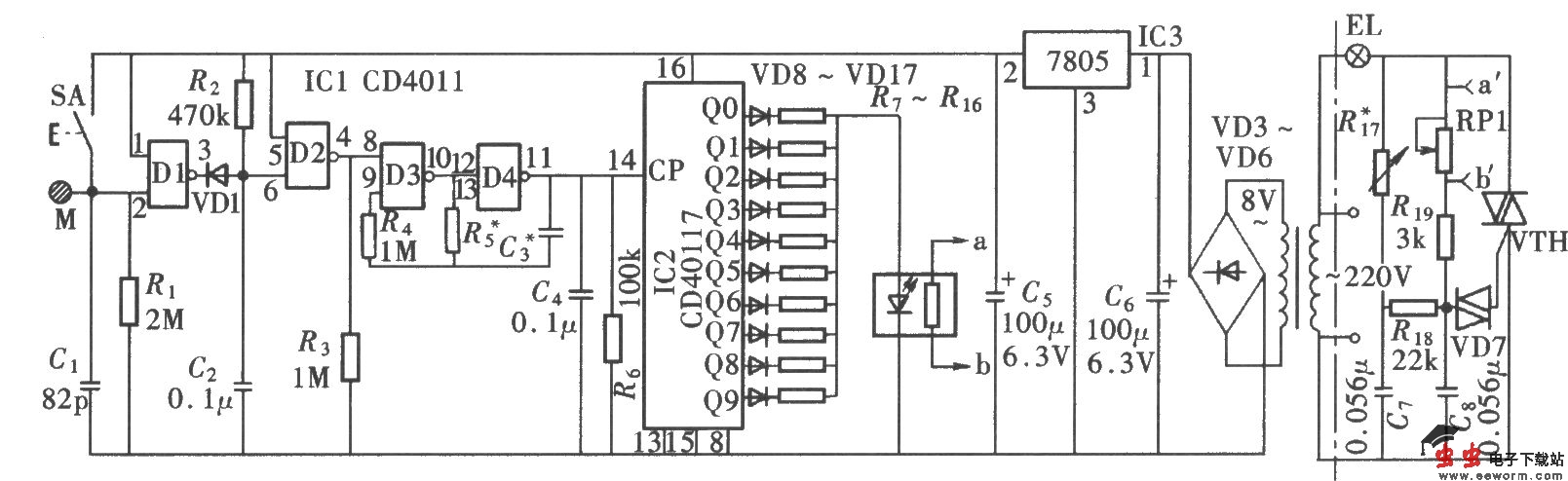 触摸数控式调光灯利用人体触摸启动脉冲发生器,利用计数器输出端所接电阻阻值的不同,通过改变光耦器中发光二极管的亮度,调节光晶闸管的导通程度,达到调光的目的,其电路组成如图所示。电路由触摸信号输入电路、脉冲信号发生器、脉冲分配器、光耦合器与晶闸管触发与导通角控制电路组成。