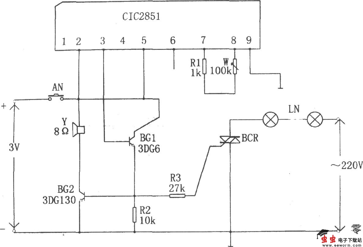 当按一下开关AN时,CIC2851被触发工作,其输出端(3脚)输出音乐信号,该信号经BG1和BG2放大后驱动扬声器发出乐曲之声。同时,双向可控硅SCR被触发导通,将彩灯链LN点亮。随着音乐信号的频率和强弱的不同,SCR的导通角发生变化,从而使彩灯链随音乐节奏的变化而发出相应的光。调节W改变音乐电路的演奏时间,即可改变彩灯链的闪动时间。调节R3也可改变SCR的触发信号的强度,若仔细调试,则可使彩灯链的闪动达最明快。