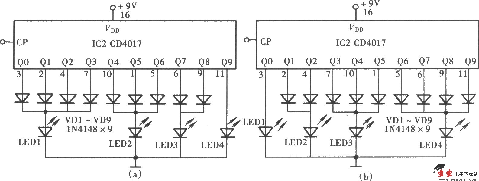 如图所示为由CD4017组成的LED加、减速运动显示器。(a)为加速运动显示电路,在它所连接的四个发光二极管中,LEDl通过隔离二极管VDl-VD4与输出端Q0~Q3连接,接通电源后,Q0输出高电平,LED1发光,在Q0~Q3输出期间,LEDl保持发光不变。