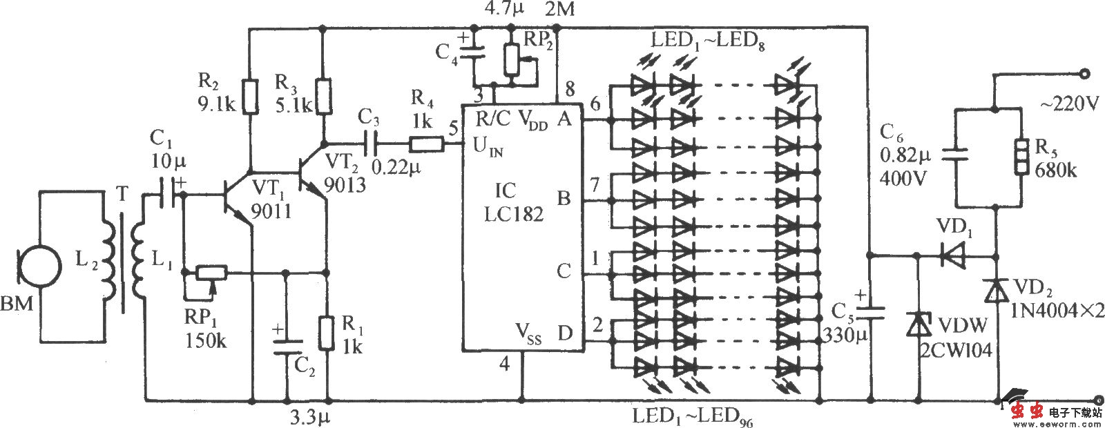 电路如图所示。它由拾音器及阻抗变换器,直耦式双管放大器、彩灯控制器和直流供电电压源等组成。
