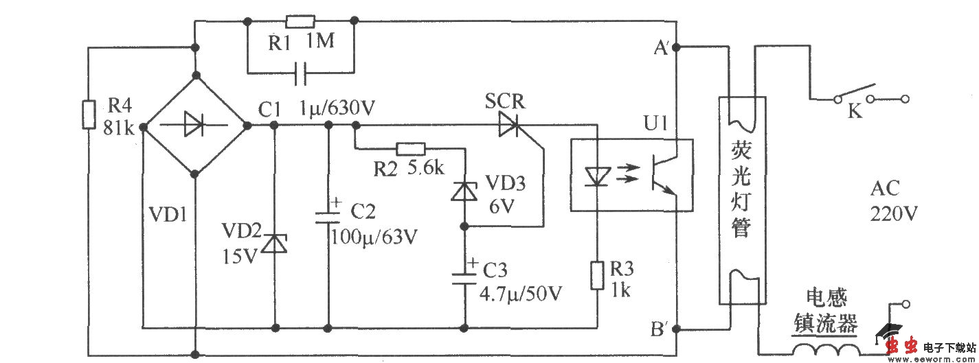 传统的荧光灯启辉器是氖管式,氖管启辉器的启动时间受环境温度和电压变化影响较大,使用不理想。如图所示是一种光控启辉器电路,它可解决荧光灯随温度降低和电压变化而启动慢或不能启动的问题。它的主要器件是晶闸管和光电耦合器。开关K接通后,市电220V经过荧光灯丝和R1、C1阻容降压及R4分压后,再经桥堆VD1整流、C2滤波及15V的稳压二极管VD2后给单向晶闸管及光电耦合器供电。单向晶闸管的控制电压由R2、6V稳压二极管VD3和C3供给,在电源接通1s内,晶闸管SCR即导通,光电耦合器U1内发光二极管发光,光敏三极管受光后导通,使荧光灯灯管的灯丝有大电流流过进行预热。此外,光敏三极管导通又使电子启辉器控制端短路,电子启辉器失电,光电耦合器内光敏三极管由导通突然截止,相当于将灯丝电路断开。由于电感镇流器的作用,在荧光灯管两端产生高压将荧光灯点亮。荧光灯点亮后;灯管两端A'B'间的电压会降低到50V(6W)至108V(40W),此电压再经阻容降压和分压后便使其整流后的电压更低,这个电压不能使得稳压二极管VD3反向导通,因而SCR不会导通,光电耦合器也不会工作,只有在关断电源后再次启动才会重复上述工作过程。 光控启辉器电路