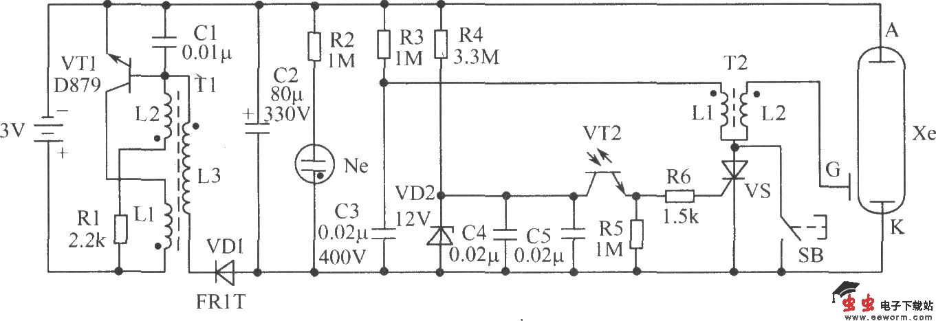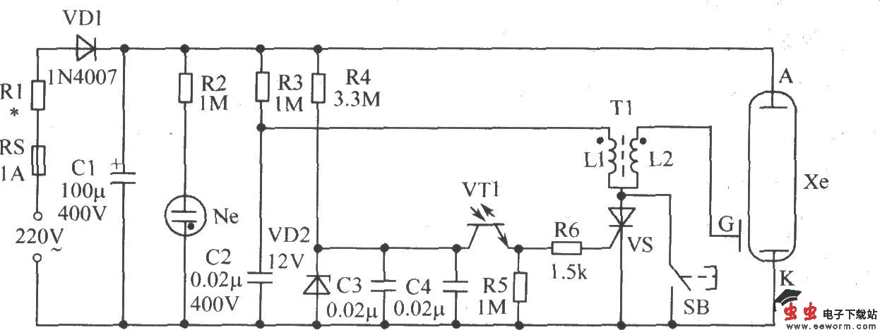 摄影爱好者在室内进行静物或人像摄影创作时,摄影灯光的布置是个重要的环节,除了大功率摄影灯外,利用如图所示的同步闪光灯是投资少、节约能源的选择。元器件选择:VT1要选电流在0.5A以上、耐压30V以上,放大倍数在200以上的***率管,光敏三极管可选用红外遥控装置中的红外接收管代用。因氙灯闪光有较强的近红外线辐射,红外接收管可避免环境杂散光线的干扰。单向晶闸管选用常见的1A、耐压400V以上的即可。高压整流管VD1工作在高频振荡状态,不宜选用常用整流管,如1N4007之类,宜选用开关电源用快速恢复二极管,耐压1000V以上。触发电路中的C3,因待机时的电压超过300V,故不能采用普通电容,应采用耐压400V的CBB电容。照相机内藏闪光灯的闪光管长20mm~30mm,储能主电容器的大小与闪光管、闪光指数有关,可根据需要和可能选用。振荡变压器因工作频率为10kHz左右,铁芯为E型铁氧体,L1、L2和L3的参考匝数为12、24、1250。触发线圈的L1、L2参考匝数为20、600,次级线圈L2要分3段绕制。该电路可以用交流电直接供电,电路如下图所示: