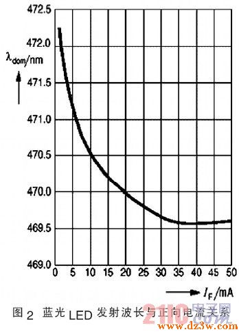 蓝光(InGaN)LED 的显示波长(色彩)会随着正向电流的变化而改变,如图2 所示。蓝光LED 的正向伏安特性是图3 众多曲线之一。