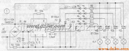 1.开启电源,电路工作在任意方式上,接着循环到方式2~7上,自动循环跳动。