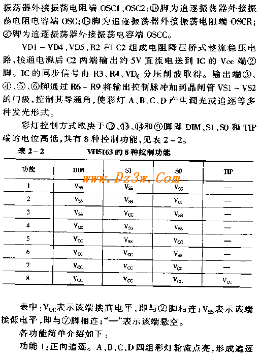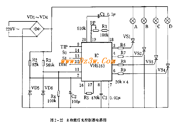 八功能灯光控制器电路图 这里介绍的是目前最新设计的光控制器,功能最全、变幻无穷,它具有三种追逐模式、三种调光模式、一种全自动循环模式和一种功能锁定模式,可以广泛用于精品框、橱窗、卧房、客厅等场合彩色灯光控制。 工作原理