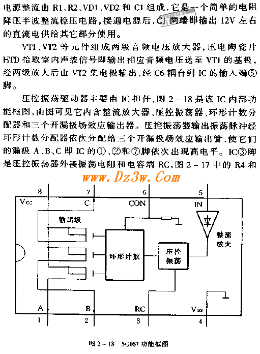 声控流水彩灯电路图 这里介绍的流水彩灯别具一格,它的流水速率可随室内音乐声响度而改变。音乐声愈响,流水速度就愈快。如用它来渲染家庭舞会气氛,彩灯的流水速度就会随着舞曲节奏高低而变化,其艺术效果是可想而知的。 工作原理 声控流水彩灯的电路如图 2-17 所示。电路由电源整流、音频放大器、压控振荡驱动器和晶闸管可控输出器等四大部分组成。
