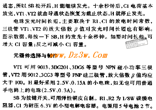 人们有时半夜醒来,想看一下手表往会驱赶睡意。如果打开电灯,强光往往会驱赶睡意,这里介绍一个小电器,晚上睡觉时将它放在枕头边,需要弱光照明时,只需轻轻按一下它上面的按钮,就会发出柔和的光线,一十几秒钟后又能自动熄灭。由于它光线柔和,使用时不需要“开”、“关”两次动作,因此不会影响睡意。