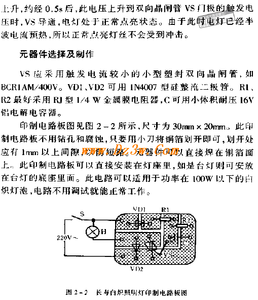 长寿白炽照明灯的电路如图 2-1所示。开灯时合上开关 S 的瞬间,由于电容 C 两端电压不能突变, R2 两端电压为零,故晶闸管 VS 截止。此时流过灯泡H的电流是经VD2半波整流后的半波电流,灯泡处于欠压工作状态发弱光,冲击电流小。电容 C 经 VDI 、 R1 充电,使 R2 两端电压逐渐