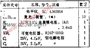 电路工作原理LM3914装有10个比较器、基准电压电路及分割电阻的电阻网络等,用外接分压电路把基准电压调到+5V。内部电路便可把0~+5V的输入电压分成十等分后进行比较、显示。输入为0V时,LED全部熄灭,输入电压超过+0.5V时,LED1发光,+5V时,LED10发光,用开关接通,可进行条形显示,开关断开时进行点阵显示。VR1的调整方法:从输入端输入5.00V,调整VR1使显示最高电压的LED开始发光即可,发光二极管已排列成进行条形显示所需的阵列。也可把10个方形LED排列在一起。显示用的LED和电路底板已经组装在一声底板上,可装在仪表面板上。