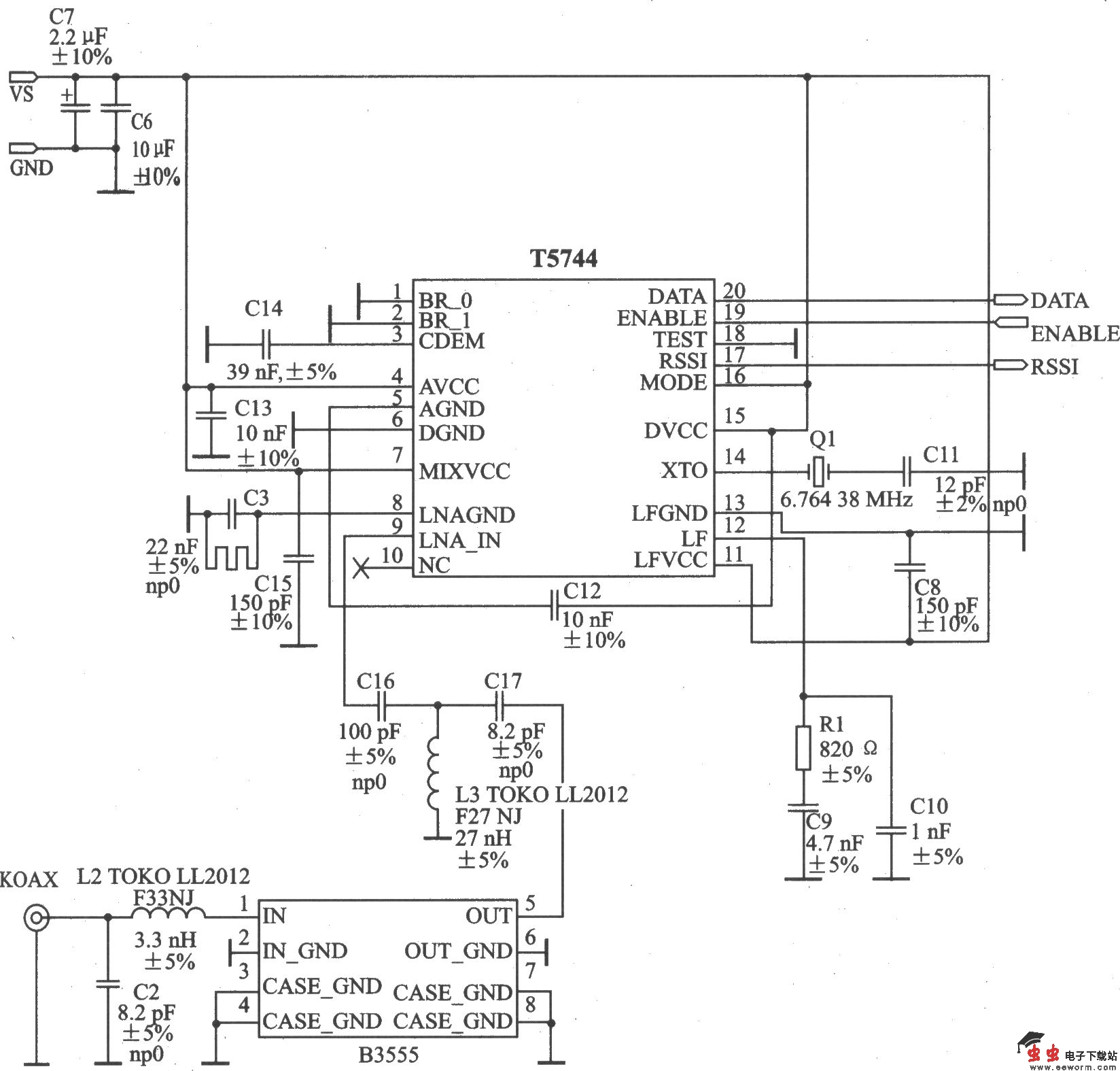 T5744工作在433 MHz用SAW滤波器的应用电路