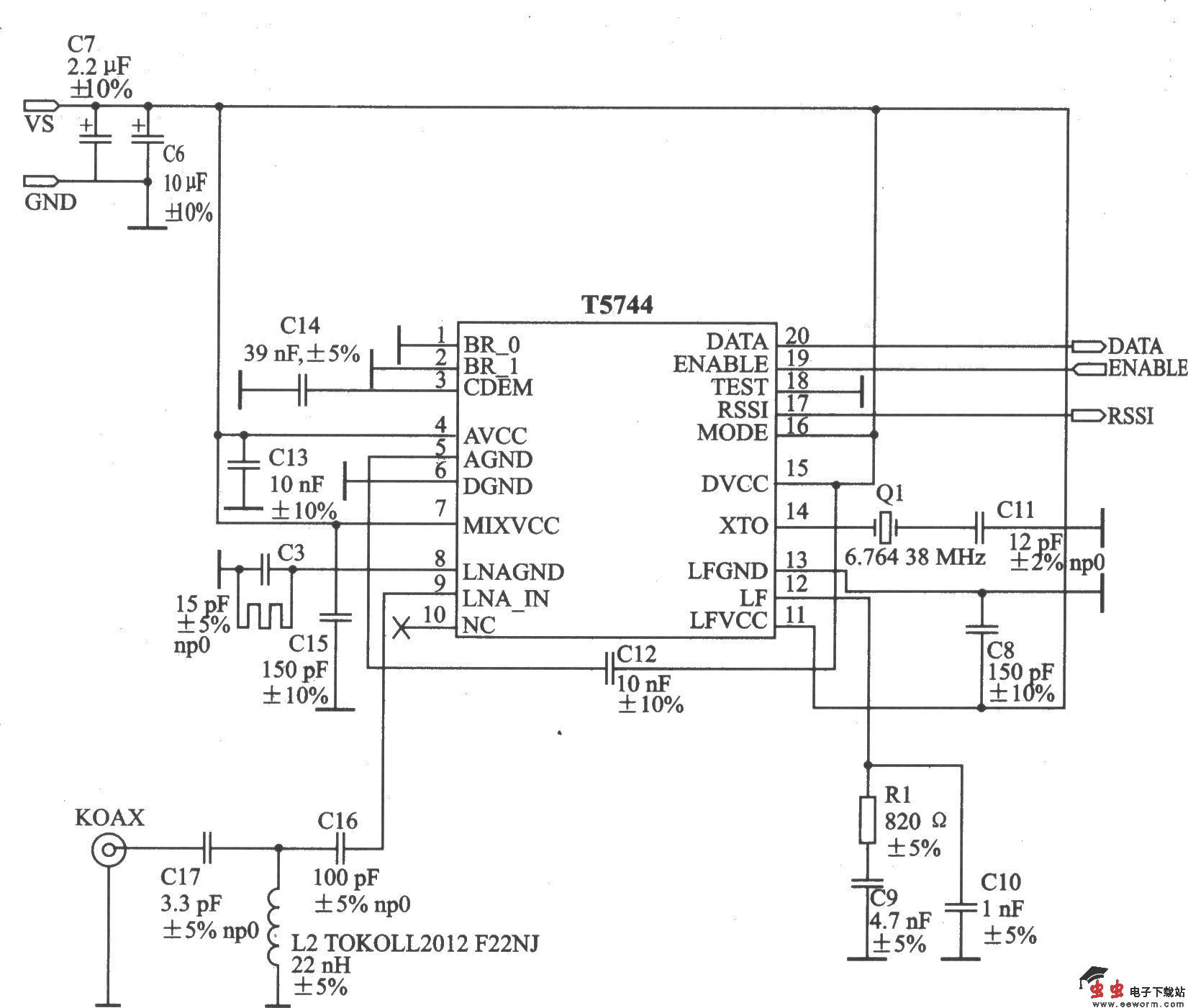 T5744是一款单片PLL接收机器件。它是为满足低数据率、低成本RF数据通信系统要求而开发出来的。T5744主要应用在无线电遥测、保安技术和无键输入系统等领域。 主要技术特点如下: ·除天线适配电路外,只需很少外围电路,PCB板上没有其他RF元件; ·编码方式为曼切斯特或双相位方式; ·完全集成VC0; ·电源电压为4.5~5.5 V; ·数据传输速率为l~10 Kb/s; ·工作频率为300~450 MHz; ·单端RF输入,容易与λ/4天线或PCB板的印制天线相适配; ·ASK调制/解调方式; ·通过RSSl指示信号强度; ·有工作和睡眠模式选择; ·符合美军标MIL-STD883 ESD保护(4KV HBM); ·在中频放大器结构中使用SAW前端滤波器,有非常高的镜像抑制特性; ·利用微控制器μC可以实现电源管理。
