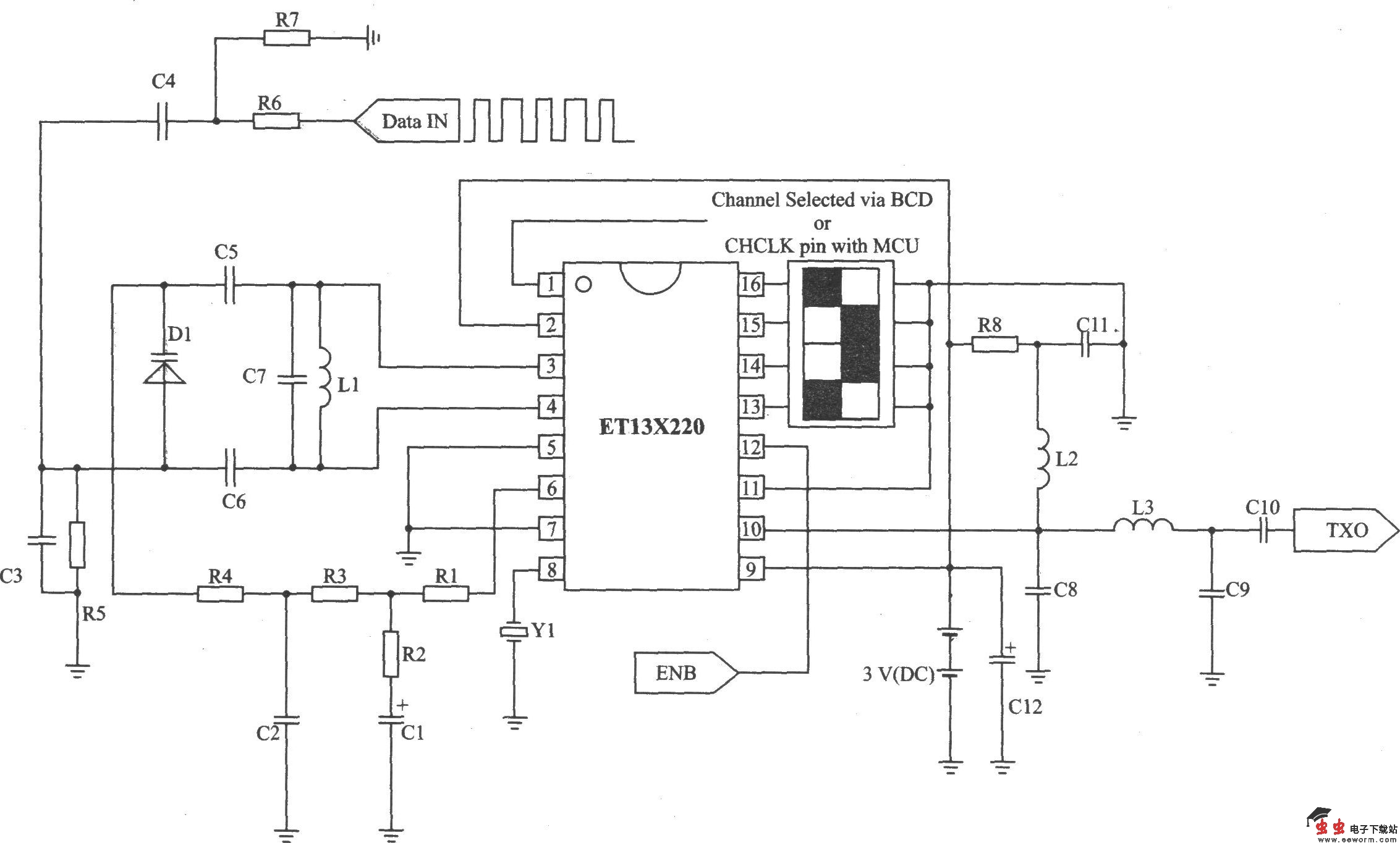 ETl3X220 是进行RF连接的低成本单片发射器芯片,能提供10个通信,适合无线鼠标和键盘及通信产品的应用。 主要技术特点如下: ·模拟FM或数字FSK调制方式5 ·信道间隔频率约为30 kHz; ·电源电压为2.3~3.6 V; ·电流消耗为8 mA,低功耗模式为5 μA。