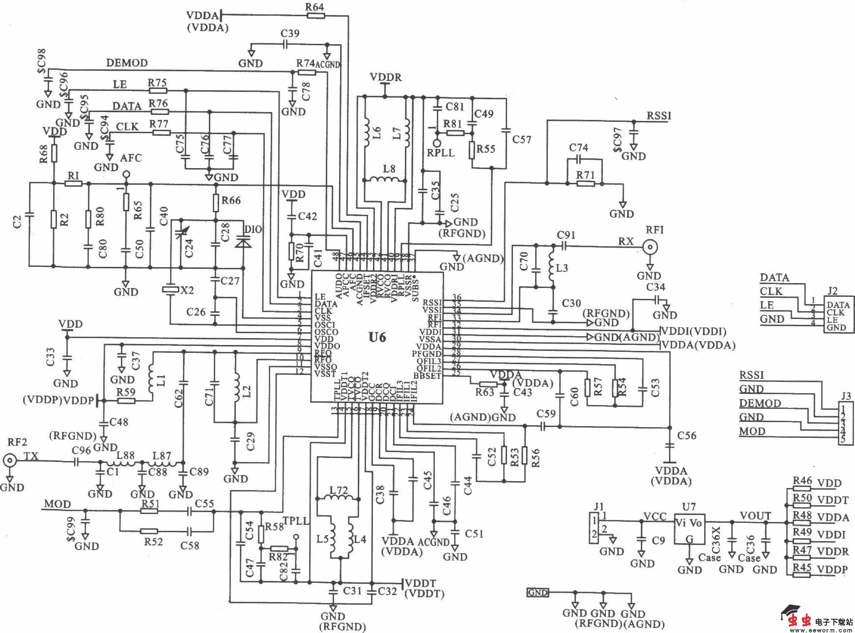 WE904/WE905是全双工通信的收发器,适合美国ISM频道(902~928 MHz)、欧洲SRD频道(868 MH。)无线声音/数据产品、900 MHz无绳电话和遥感/遥测数据传输的应用。 主要技术特点如下: ·工作频率为0.1~1 GHz; ·FM/FSK调制方式; ·接收灵敏度为-l03 dBm; ·发射输出功率为 3.0 dBm; ·工作电压为2.7~3.3 V; ·直接变频,零一中频结构; ·片内双VC0,串行可编程接口。