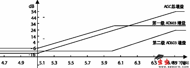 根据实际设计应留有一定的余量。将第一片AD603的增益范围定为 -6~30dB,则相应的V12为-400~500mV,而其2脚已固定在5.5V,故1脚的控制电压即VAGC应为5.1~6V。第二片AD603的增益范围定为-10~24dB,则相应的V12为-500~350mV,而其2脚已固定在6.5V,故1脚的控制电压即VAGC应为6~6.85V,两片顺序级联后的总增益范围为-16~54dB,如图3所示。