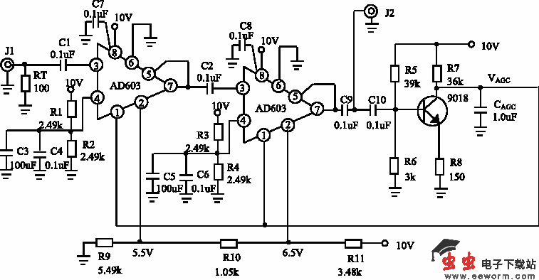 选用AD603作为主放大器,两片AD603采用顺序级联形式,充分发挥每一片AD603的增益控制功能。AGC检波由9018完成,9018同时送出AGC控制电压。完整的放大器及AGC电路如图2所示。
