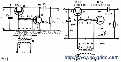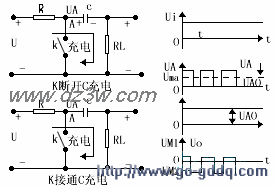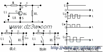 下图(a)为串并联调制器及其波形图。BG1与负载RL串联,BG2与RL并联,两只场效应管BG1、BG2分别为受电压Ua1与Ua2控制;而Ua1与Ua2对地点来说,相位相反,若在0-(T/2)时间内Ua1为正,则Ua2为负,使BG1导通和BG2截止,此时Uw=Ui若在(T/2)/T时间内Ua1为负,则Ua2为正,使BG1截止和BG2导通,此时,UW=0。经过耦合电容C2后,滤UW中的直流分量,在负截RL两端得到 了交流的调制方波,在下图(b)中是双直流输入信号(Ui和Uf)的串、并联调制器及其波形图,它可同时完成调制与比较两项任务,输出电压UO正比于两输入信叼的幅值差,工作原理与上述相同