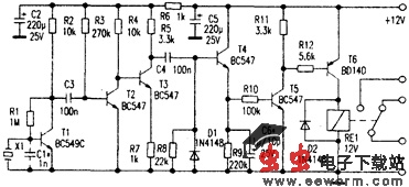 如图所示,压电传感器X1产生的电压由晶体管T1等组成的第一级放大器放大约100倍。晶体管T2起检波的作用,其集电极电压只有50mv。由于R3将T2的基极直接接到电源正线,T2总是处于导通状态而不起放大作用。如果需要增大放大倍数,可将R3的上端改接到T2的集电极。晶体管T3提供约3倍的电压增益,并驱动脉冲检波器D1。当输入的脉冲电平足够高时,T4迅速向C6充电。脉冲过后,C6通过R9和R10及T5基射极组成的高阻抗电路缓慢放电,此放电时间决定了继电器的接通时间。因此C6所需的容量需要通过试验来决定,其值可在1uF-10uF