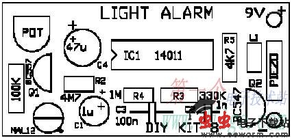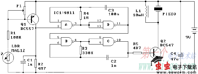 当光敏电阻未感应到光照时呈高阻状态,Q1截止,后级电路不工作;当光敏电阻被光线照射后立即转换为30Ω以下的低阻状态,Q1获得偏置导通,由CD4011组成的振荡器开始工作,振荡信号经Q2放大后驱动压电片发出报警信号。 本电路稍加改动后,也可以用于继电器或可控硅的驱动。