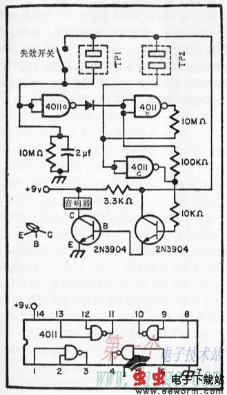 平时手指把TPI的气隙跨接,使4011a的输入端为高电平,其输出端为低电平;4011b输入低,输出高;4011c的输入高出输出低电平,故两个三极管2N3904(接成复合管)都截止,音响器无电源而不响。一旦手指离开TP1,4011a的输入经较短延时(由于2μF电容的放电)后就变为低电平,其输出为高电平;4011b输入为高电平,输出为低电平;4011c输入为低电平,输出为高电平,复合晶体三极管导通,使音响器工作而发出警报声。一旦触发后,即使重新用手指跨接TP1的气隙,报警也不会停止。这是由于手指重新跨接TP1后4011a的输入端虽又变为高电平,其输出端也变成低电平,但是由于二极管的隔离作用4011b的输入端仍保持高电平,故警报不停。只有当手指跨接隐藏的TP2后,4011c的输入端成为高电平,输出端变为低电平,才能使复合三极管基极成为低电平而截止,报警声中止。