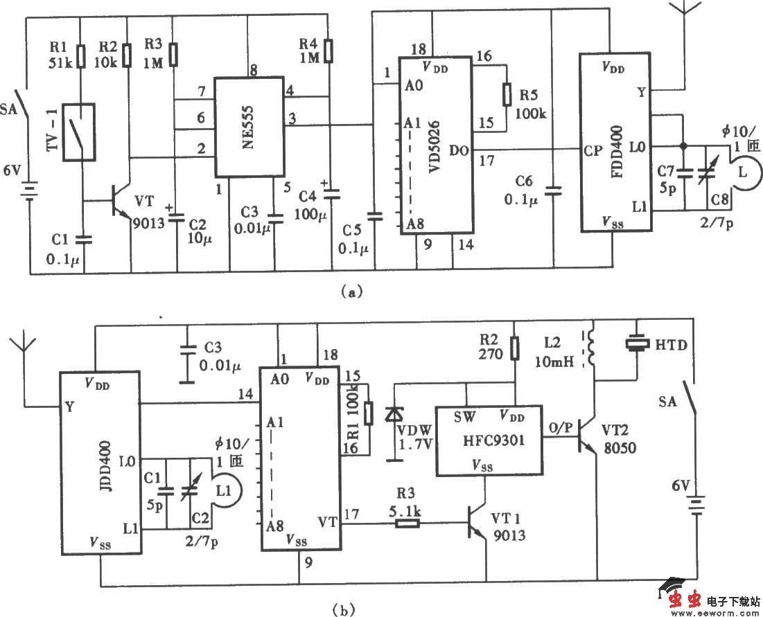 自行车防盗报警器电路 (a)发射器电路;(b)接收报警电路