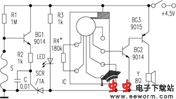 如附图所示。电路中由R1为BG1的b极提供偏置电压。在警戒状态下,b极偏置电压经警戒线S对地短路,BG1不工作。如遇盗情,S被断开,BG1立即得电工作。BG1射极电流经R2触发SCR导通,指示灯LED亮,IC输出报警信号,经BG2、BG3复合放大后,驱动扬声器放音。这时即使是把S重新接通,也照报不误,只有关闭电源开关才能解除报警,所以具有防破坏作用。
