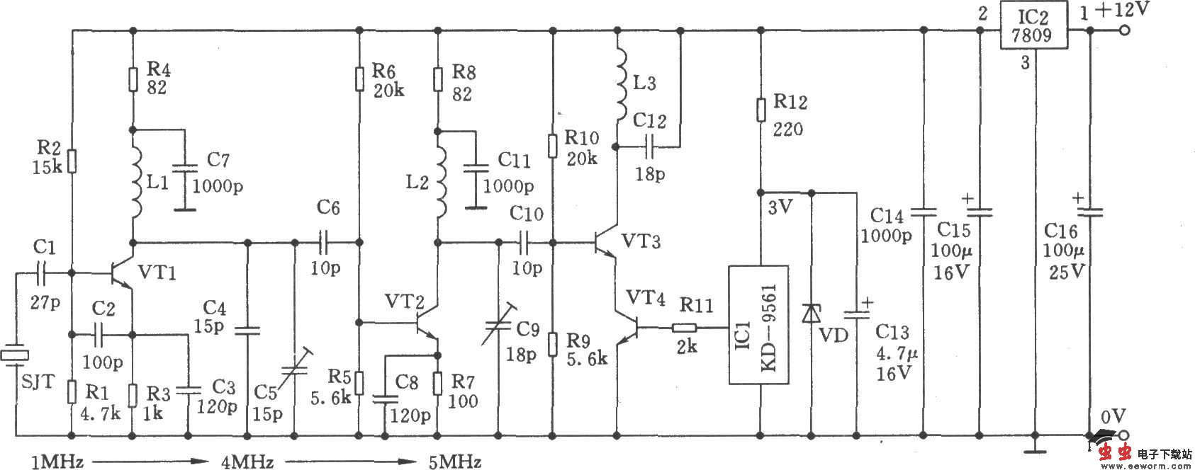 晶体三极管VTl、VT2选用3DGl30C、β≥50,VT3用L413K功放管,VT4为8050、β≥80。稳压二极管VD用3V、0.5W稳压管。ICl为KD-9561模拟软包装音响集成电路。线圈Ll~L3均需自制,用Φ1.2mm高强度漆包线在事5mm膜具上分别紧绕6T,5T,4T。圈后脱胎成空心线圈。所有高频回路振荡电容,宜采用高频陶瓷或涤纶电容器。其余阻容元件无特殊要求。天线TX用1/4λ塑胶多股导线代用。天线长度应取3.125÷4=0.78m(多股塑胶导线)。或用电视机拉杆天线代用。电池采用两块容量较大的6V电池串联成12V使用。