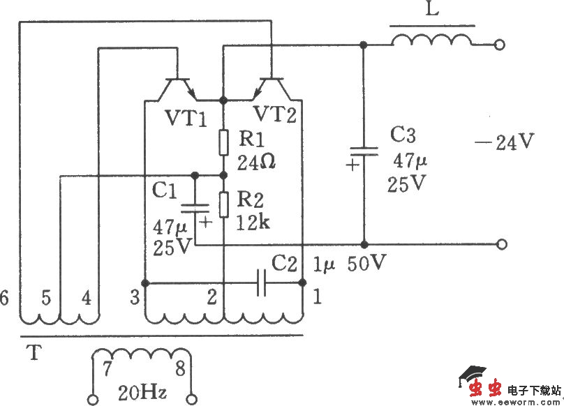 如图所示为20Hz信号发生器,可应用于电话机的振铃系统,也可用于信号源及其它电子系统的报警器用。该电路实际上是变压器T和晶体三极管VTl、VT2组成的共发推挽振荡器,两只晶体管工作在开关状态(饱和与截止),其输出波形为方波。晶体三极管功耗小,效率高。