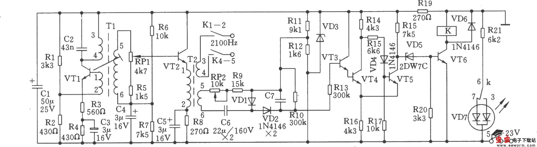 电路如图所示。由振荡、缓冲放大和告警电路组成的2100Hz信号发生器。VTl和相关元件组成集电极调谐振荡器。Rl、R2是VTl的偏置电阻,R3、R4是发射极电阻,用以稳定直流工作点,同时R3还提供交流负反馈,以改善振荡器的性能,C3是R4的旁路电容,以减少信号的损耗。Tl变压器的L3-4线圈与电容C2组成2100Hz的振荡槽路,正反馈电压由L1-2线圈取得。由于它的负载轻,所以振荡频率比较稳定,其频率稳定度≤±5Hz,非线性失真小于5%。VT2及相关元件组成缓冲放大级,采用低阻抗的发射极输出,因而负载发生变化时不致于影响振荡频率和输出电平。R6、R7是VT2的偏置电阻,R8是发射极电阻,用以稳定工作点。振荡级输出信号经电阻R5和电位器RPl组成的电平调节电路输入VT2的基极,经VT2放大后由T2变压器L3-4线圈输出。自动告警电路由施密特触发器和逻辑电路组成。VT4、VT5和相关元件组成施密特触发电路。VT3接成射极输出器,以提高输入阻抗。逻辑放大器由VT6及相关元件组成。从T2的L5-6线圈输出的2100Hz信号经VDl、VD2、电容C6、C7、电阻Rl0组成的倍压整流,送至施密特触发器。当2100Hz输出电平正常时,电容C7两端约为4.4V,此时VT3、VT4导通,VT5截止,VT5集电极电位升高,将齐纳二极管VD5击穿,所以VT6导通,继电器K通电吸合,触点K1-2、K4-5闭合送出2100Hz信号。触点K7-8闭合,发光二极管VD7显示绿色工作指示。当2100Hz输出电平比正常电平低3.5dB时,C7两端电压约为3.4V,达不到触发值,所以VT4截止,VT5导通。因而VD5不通,VT6截止,继电器K失电而释放,触点K1-2、K8-9断开,K8-9闭合。无2100Hz信号输出,发光二极管VD7显示红色告警信号。电位器RP2为调节继电器K动作电平值。